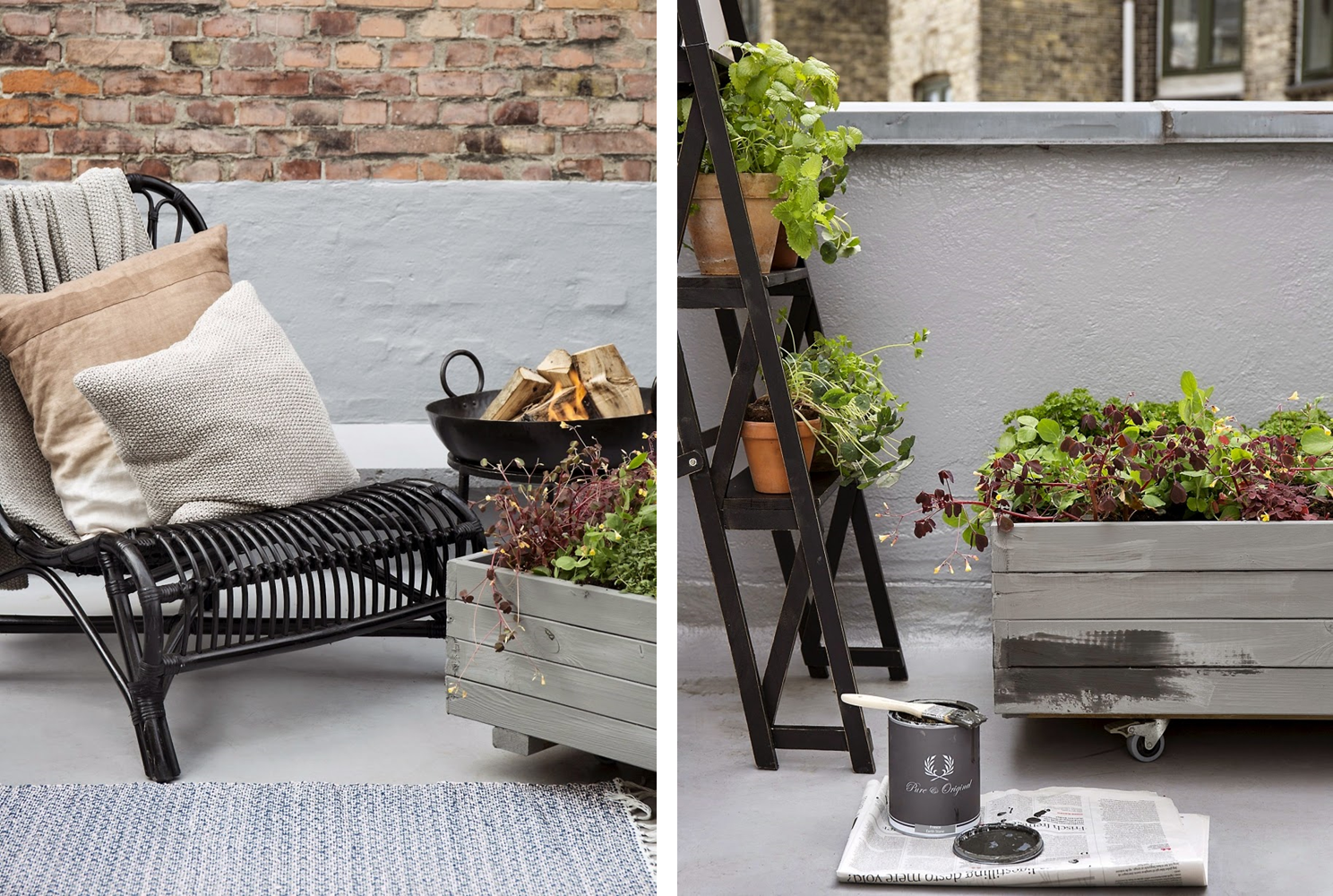 Otro miércoles mas acudo a mi cita semanal con el reciclado. En esta ocasión os presento un terraza realizada con objetos, muebles y elementos recuperados. Su decoración adquiere cierto aire Vintage-industrial debido a la utilización de mesas y sillas de metal viejas que transmiten este estilo a la decoración de esta terraza. Aquí se vuelve a recurrir al uso de las tan socorridas cajas de madera recicladas para decorar un balcón o terraza que se reutilizan como estanterías, contenedores o jardineras. También en esta ocasión volvemos a visualizar escaleras de distintos modelos y colores como objeto decorativo. La paleta cromática es limitada, tonos ocres, grises o metálicos y negros, la nota de color lo ponen las plantas de aspecto delicado y romántico, como helechos, hortensias o geranios, repartidas tanto en macetas tiestos y jardineras colocadas en el suelo, escaleras o paredes.