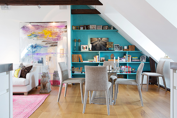 Se trata en este caso en concreto de un interiorismo especial en el que se fusionan lo antiguo y lo moderno, los dos conviven en un mismo espacio lo cual enriquece al conjunto y engrandece la composición. Mención aparte merecen las pinturas colgadas en las paredes que dan autentica personalidad al apartamento y la librería de color azul intenso que imprime carácter al comedor.