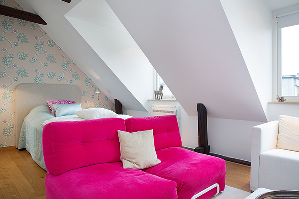 Este acogedora buhardilla de aire bohemio esta ubicada en Estocolmo y como buen representante de la decoración sueca se caracteriza principalmente por espacios abiertos, luminosos, puros y de lineas suaves donde la idea " menos es mas" cobra especial sentido gracias a su estética inconfundible. El blanco predomina en todo el apartamento pero en este caso se ve salpicado por colores refrescantes como el rosa, azul o naranja.