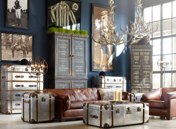 Las grandes piezas de decoración tipo alacenas o estanterías recicladas ayudaran a conseguir el efecto deseado y también puede contribuir poderosamente la colocación de grandes relojes con números romanos ,algunos de estos objetos los podrás conseguir en Restoration Hardware. Además si hay unos imprescindibles en el estilo industrial esos son: los sofás vintage de cuero y los baules. Para estos últimos te aconsejamos visitar Richard's trunks