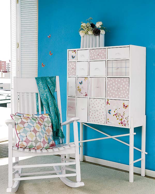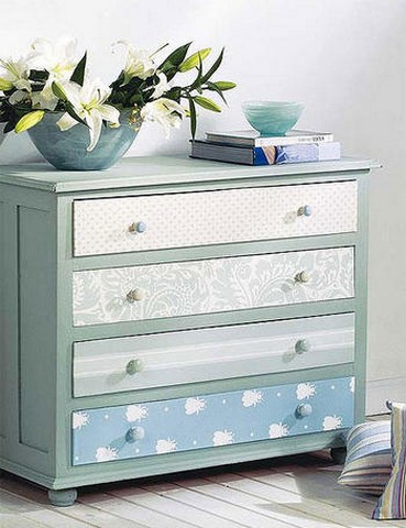 Si queremos renovar y dar un estilo diferente a nuestra vieja cómoda, sinfonier o archivador, aquí podéis encontrar un par de propuestas. La primera consiste en utilizar trozos de papel pintado que os hayan sobrado de empapelar esa habitación o de otros que hayáis utilizado en el pasado. Os aconsejamos que para que la pieza cobre mayor frescura a cada frente de cajón le pongáis un papel pintado diferente.
