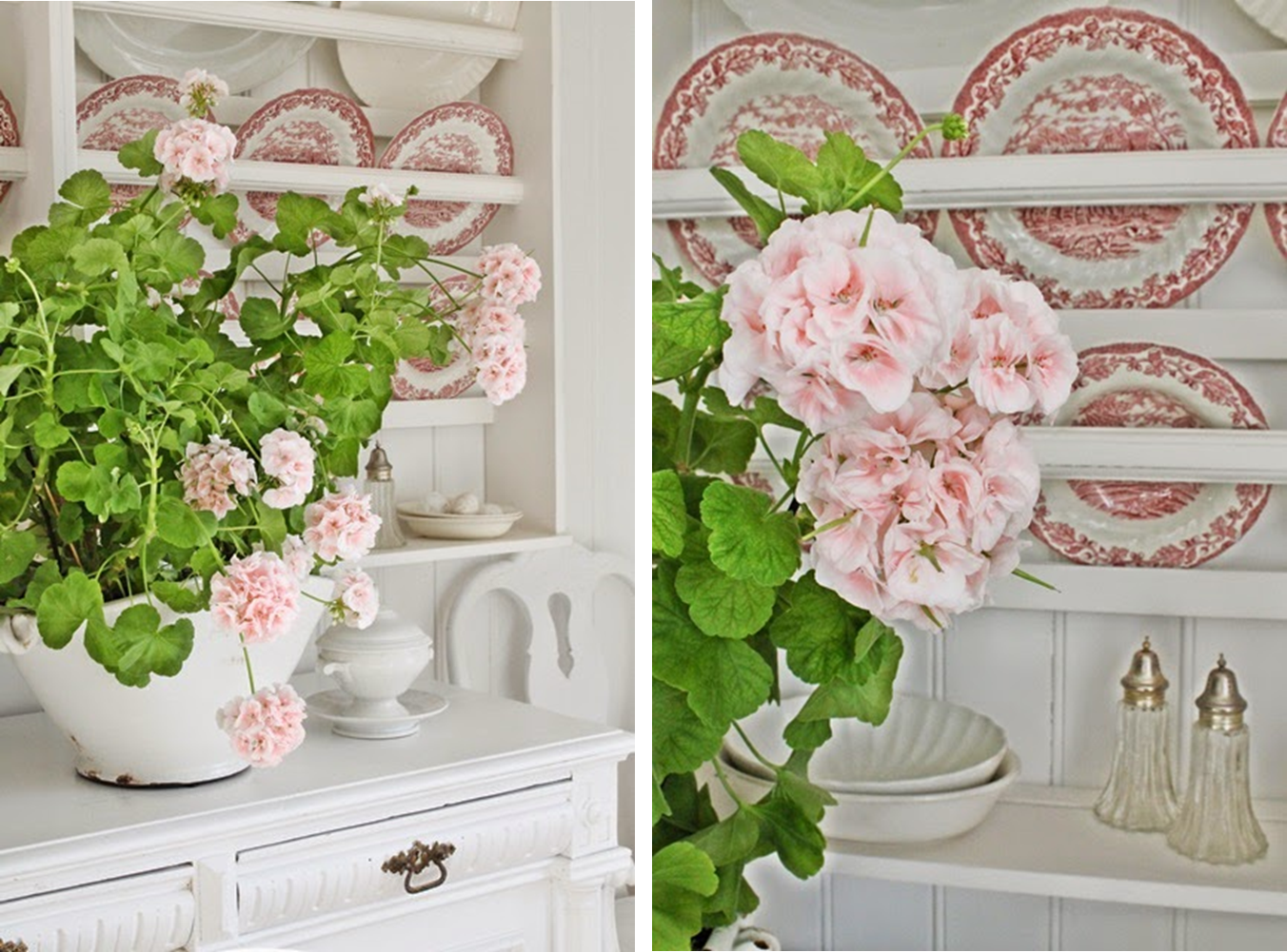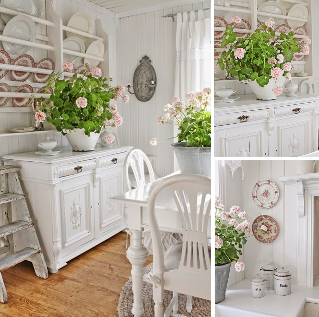Ya estamos en Mayo, el mes de la flores, para celebrar que estamos en esta época del año os acerco estos cuatro rincones Shabby chic decorados con flores: narcisos, geranios, lilas y lirios. Cada flor transmite una tonalidad y aroma especial a cada rincón, pero todas añaden mas delicadeza a este ya de por si estilo romántico y campestre.