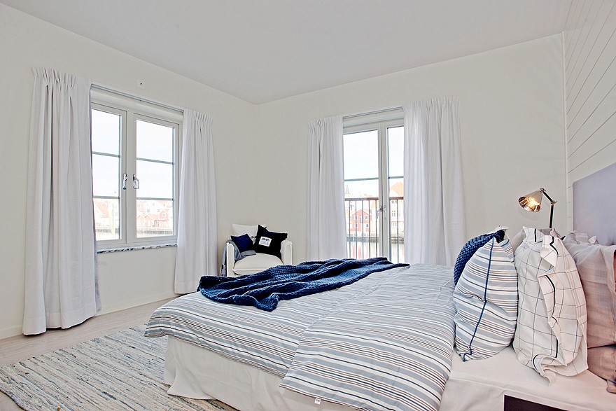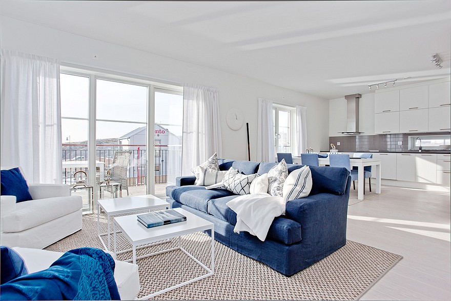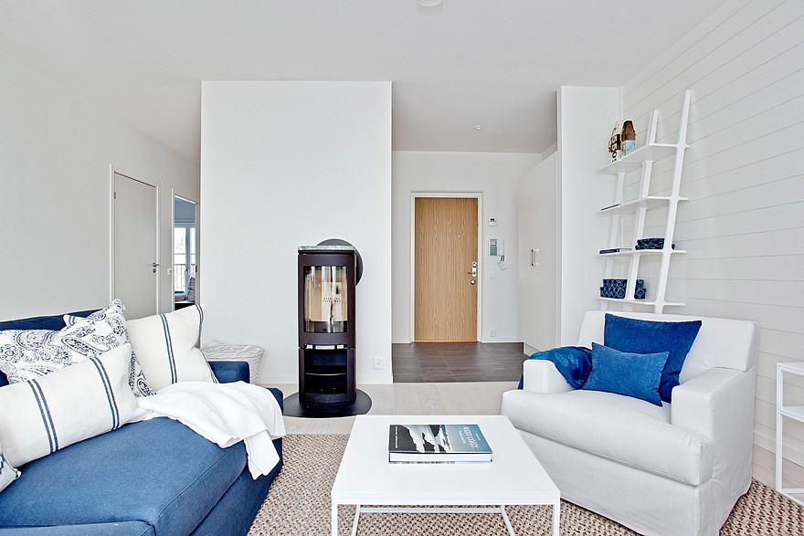 Este luminoso y elegante apartamento se encuentra en Gotemburgo rodeado por un entorno marinero. Se encuentra a escasos metros de distancia del agua y se puede disfrutar de las hermosas vistas desde la ventana. El apartamento consta de tres habitaciones y una moderna cocina americana. Sus lineas limpias y el color blanco le dotan de una especial luminosidad acentuada mas si cabe por el azul marinero de textiles y complementos. En definitiva un placer y sosiego para la vista.